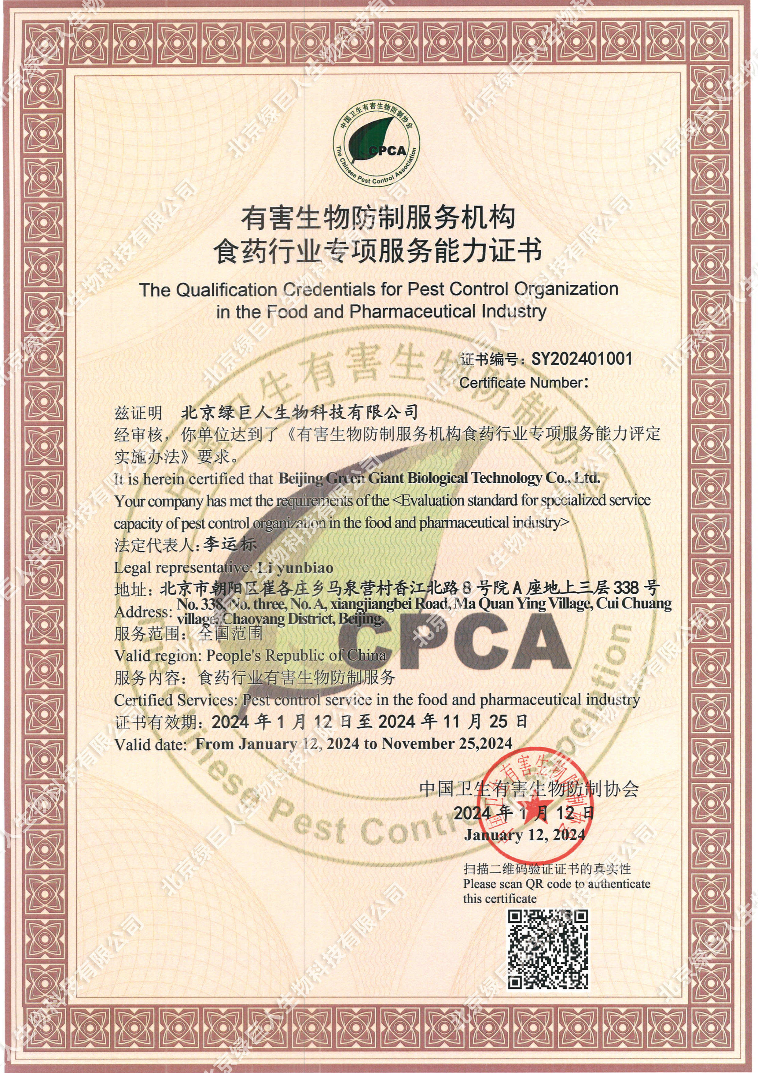 2024年1月12日,北京綠巨人生物科技有限公司獲得有害生物防制服務(wù)機(jī)構(gòu)食藥行業(yè)專項(xiàng)服務(wù)能力證書(shū)?!氨本┚G巨人”憑借13年食藥行業(yè)萬(wàn)余家大、中、小企業(yè)服務(wù)案例,以及專業(yè)的服務(wù)經(jīng)驗(yàn)和過(guò)硬得技術(shù)水平,通過(guò)了中國(guó)衛(wèi)生有害生物防制協(xié)會(huì)評(píng)審專家組一致肯定。